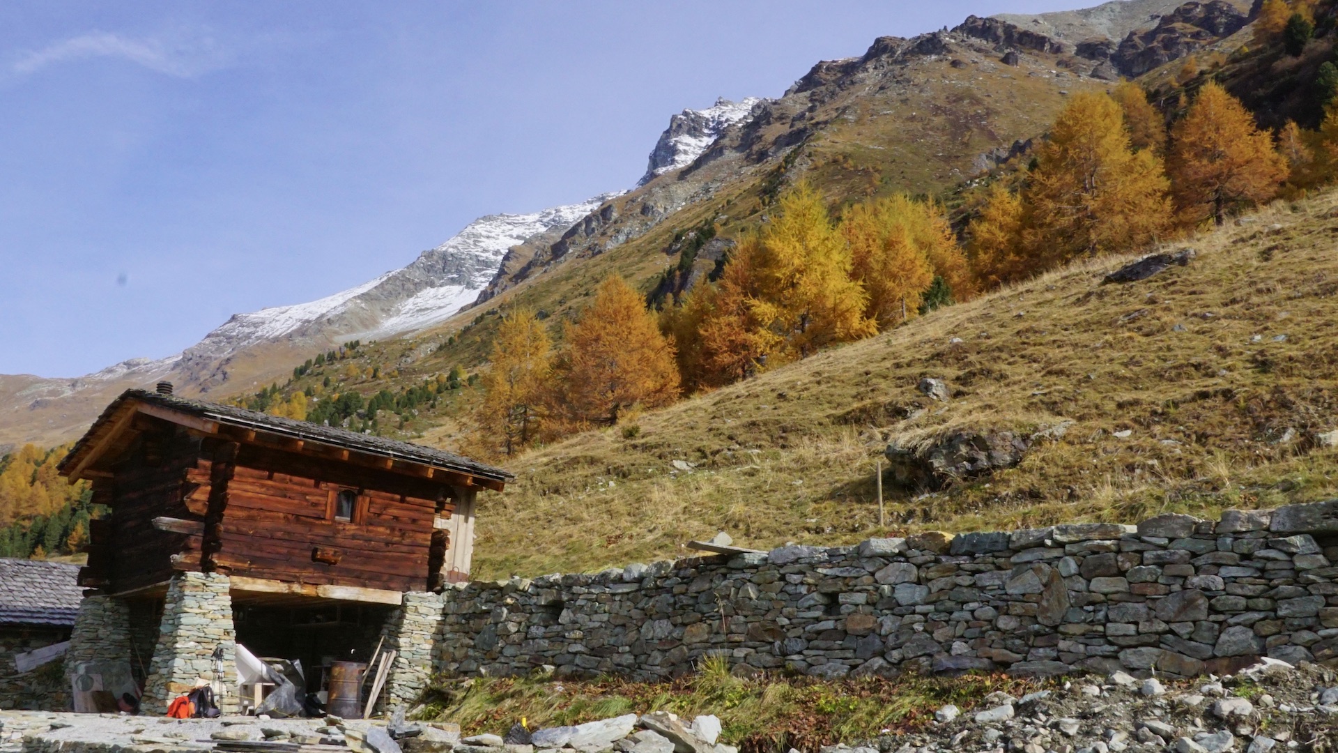 Montée par le sentier qui mène à Tracuit et première pause au hameau du Chiesso, situé à mi-parcours du Roc de la Vache. En rénovation, mais travaux arrêté depuis quelques temps.